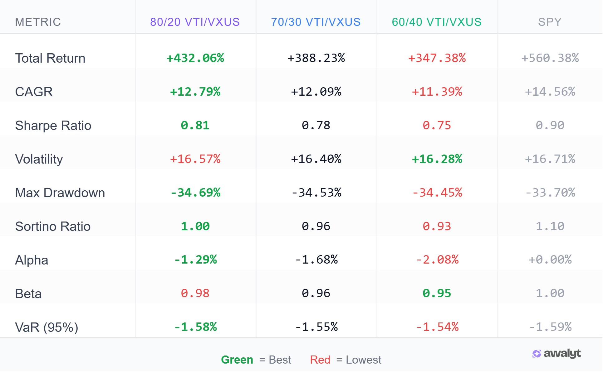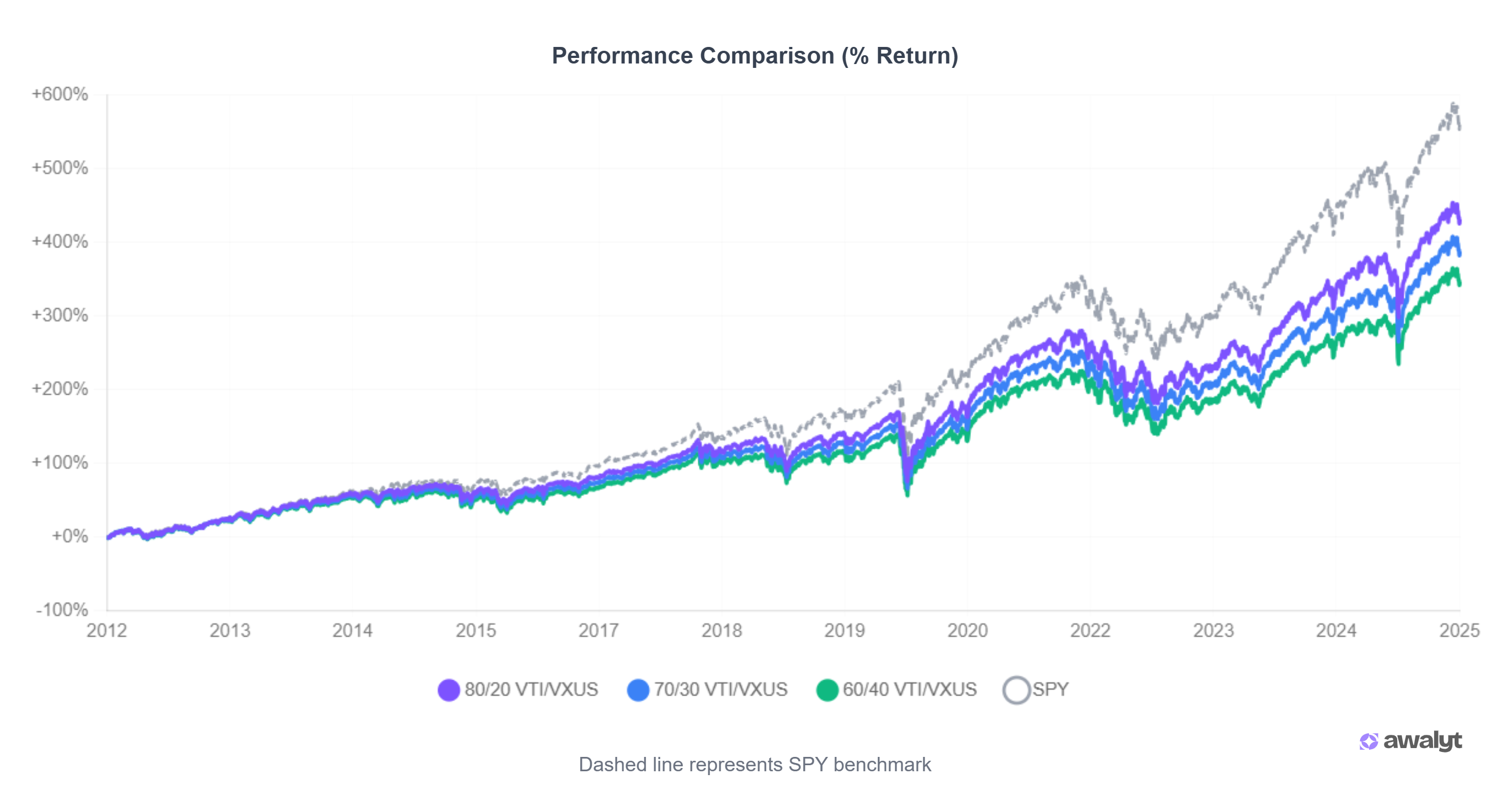 60/40 vs 70/30 vs 80/20: VTI/VXUS Backtest Results (14 Years)